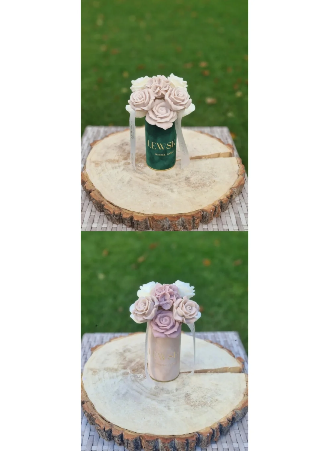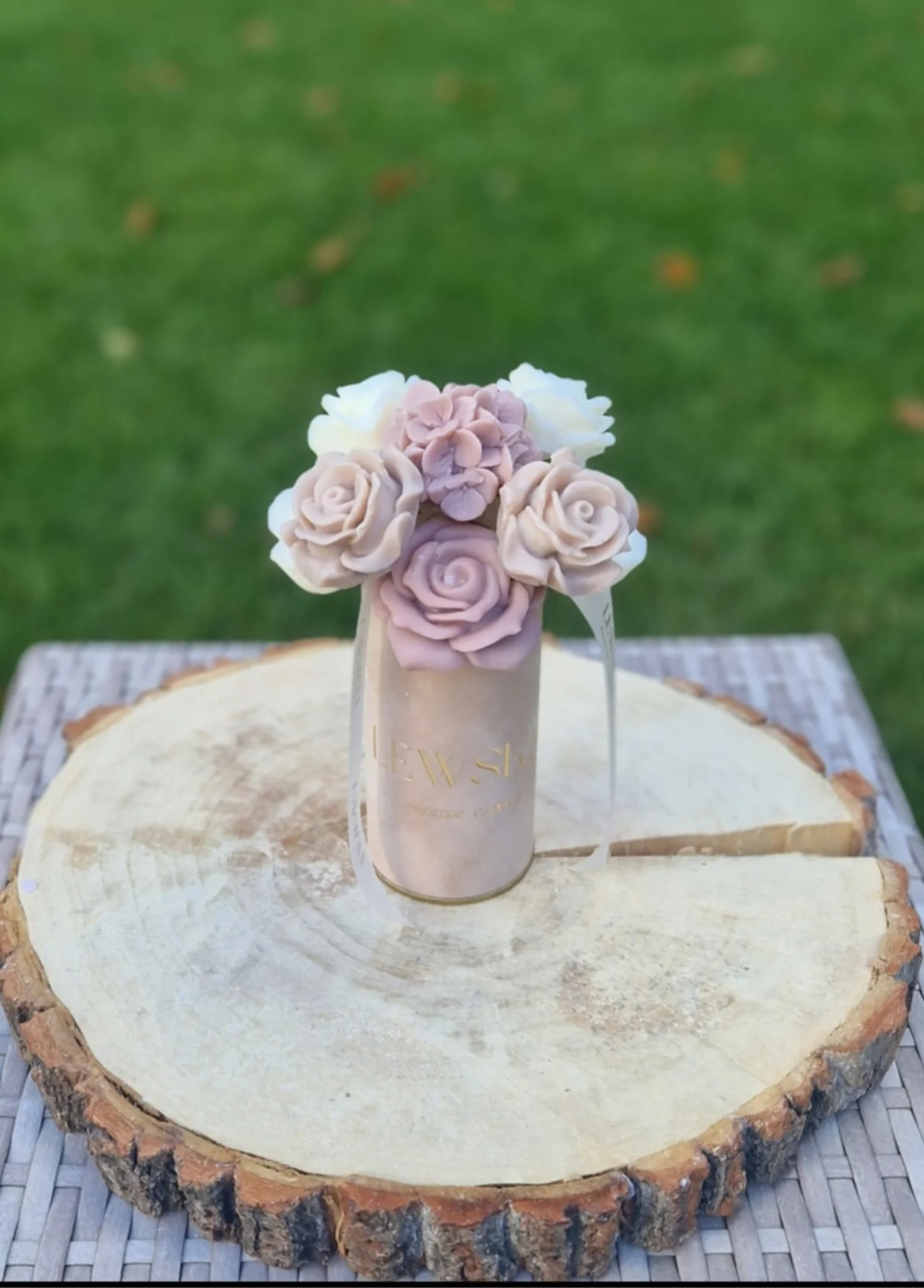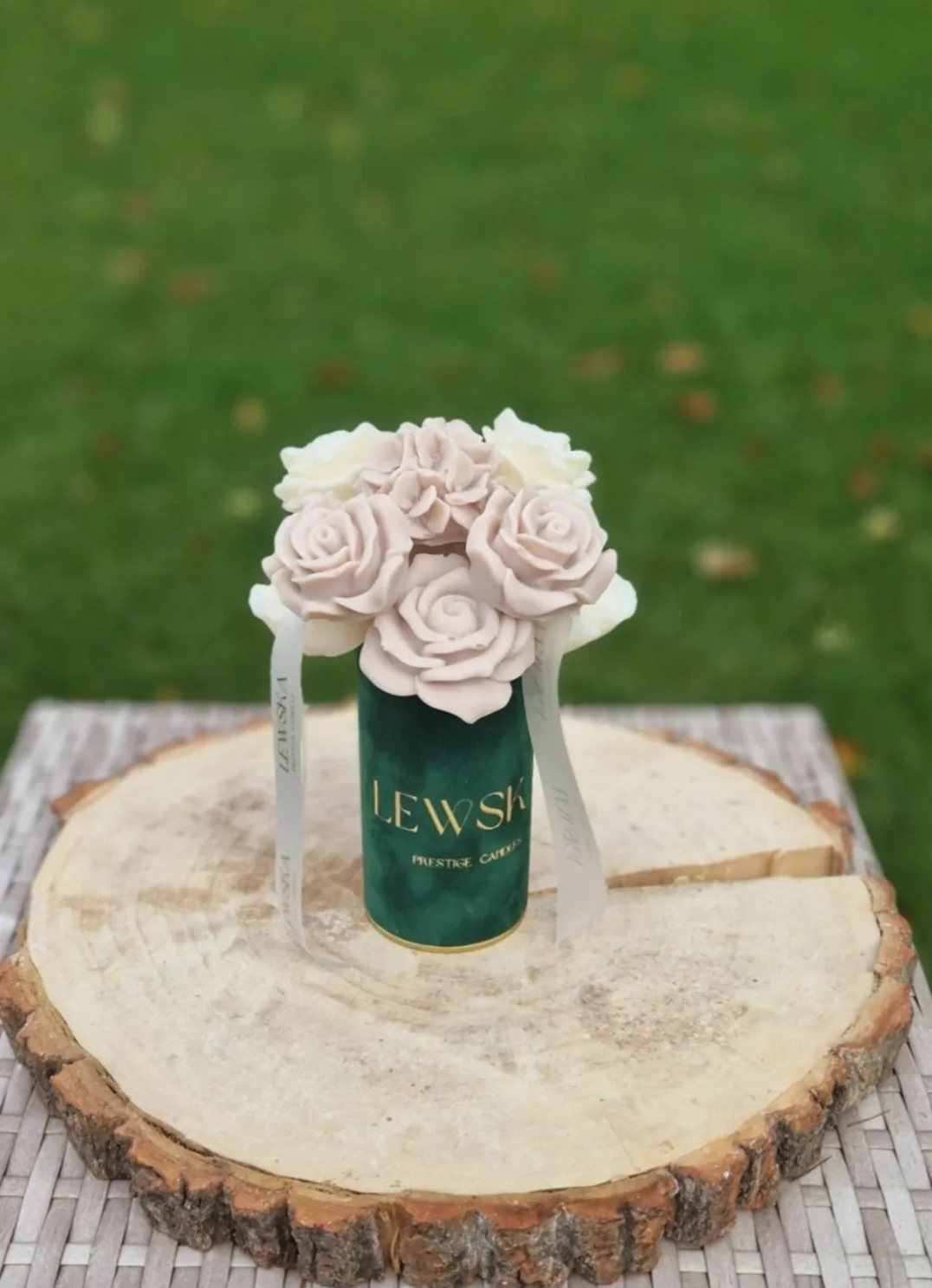 Delikatny, naturalny i ponadczasowy flowerbox sojowy w rozmiarze S, zamknięty w welurowym pudełku .W środku znajdują się ręcznie wykonane kwiaty z wosku sojowego – biało-beżowe róże, goździk oraz fiołki, tworzące spójną, subtelną kompozycję. Całość dopełnia sylikonowa wstążka ze złotym logo Lewska, nadająca boxowi elegancki, prezentowy charakter.