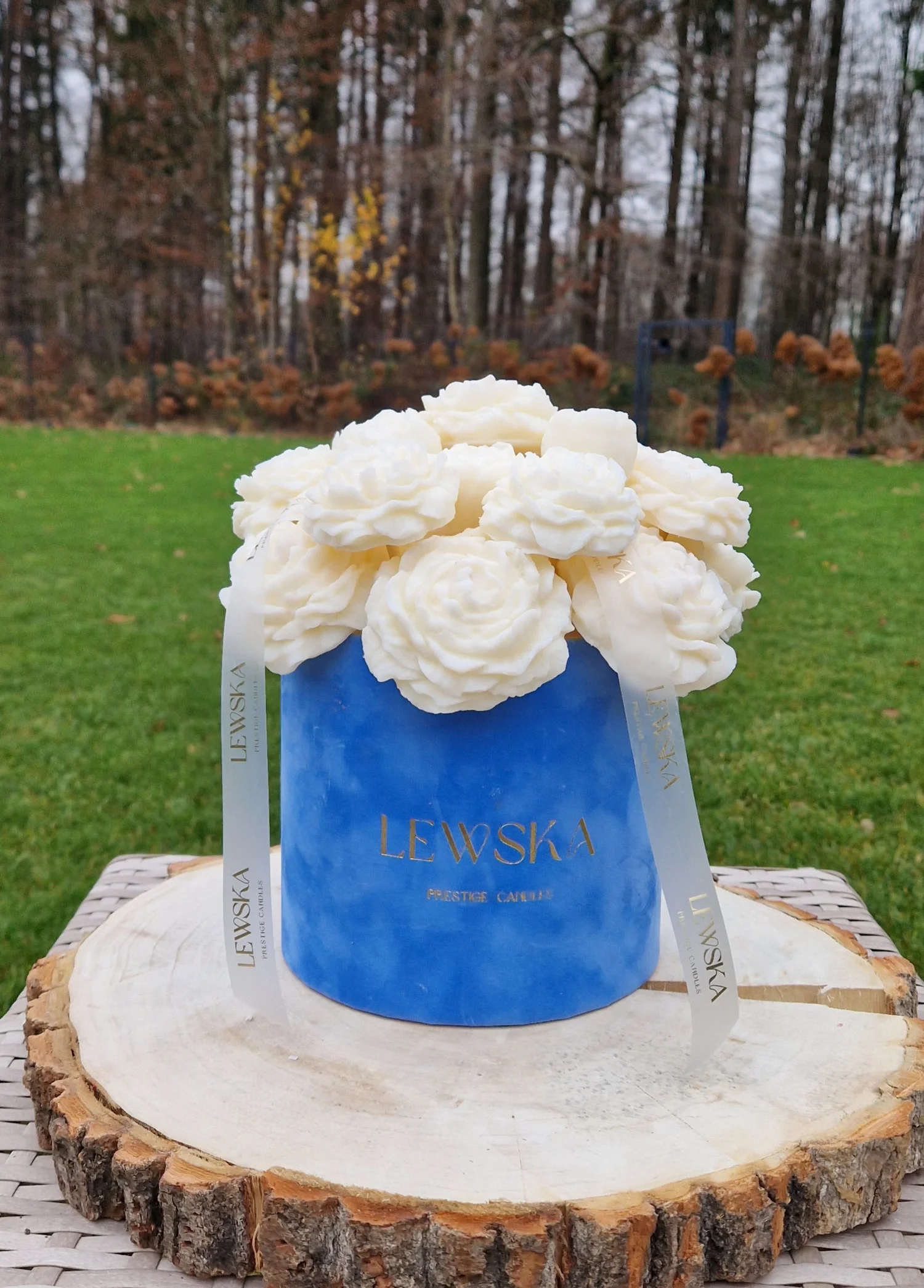 Elegancki Bukiet sojowy w kolorze niebieskim z kompozycją białych piwonii – małych i dużych to wyjątkowa pachnąca dekoracja domu o wyraźnym efekcie „wow”. Ręcznie wykonane woski sojowe do kominka w formie kwiatów zachwycają detalem, a po użyciu w kominku zapachowym stopniowo uwalniają aromat, który buduje atmosferę relaksu i luksusu. Idealny jako pachnący prezent lub stylowy akcent wnętrza.