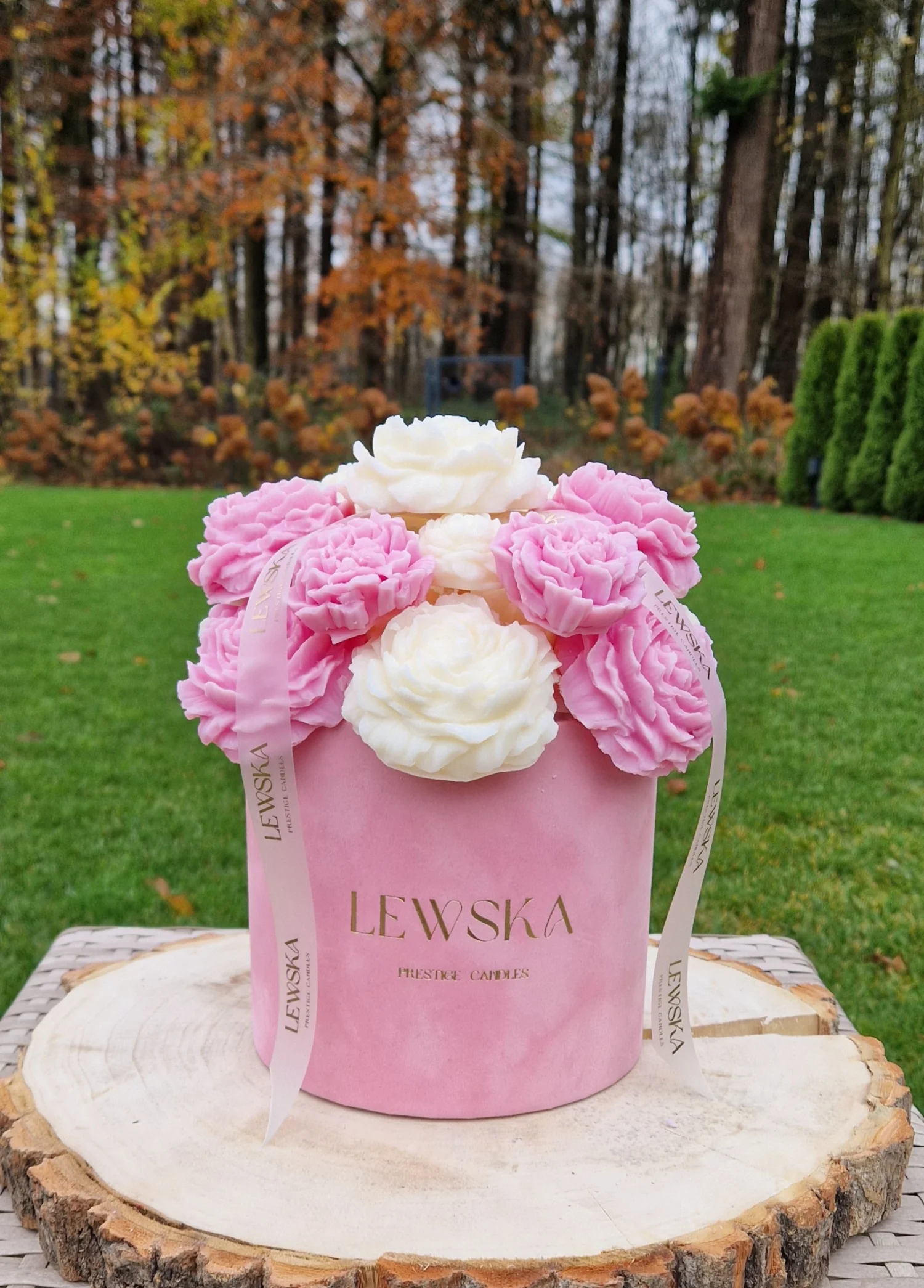 Pozwól sobie na luksus w codziennym aromacie dzięki Bukietowi L w welurowym pudełku pudrowy róż. Ręcznie wykonane woski sojowe w formie kwiatów – białe i różowe piwonie, mini pąki i goździki – tworzą bukiet, który zachwyca zarówno wyglądem, jak i zapachem.