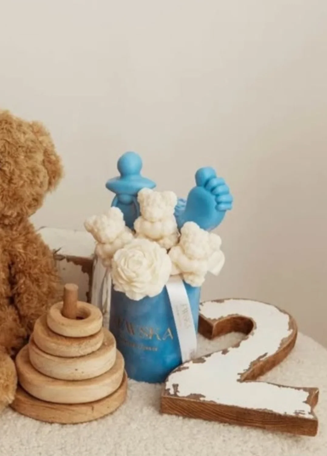 Uroczy Bukiet sojowy Baby w kolorze niebieskim to idealny prezent na roczek, baby shower i inne uroczystości. Ręcznie wykonane woski sojowe w kształcie figurek w kolorze niebiesko-białym, udekorowane białą wstążką, tworzą wyjątkowy bukiet, który zachwyca zarówno wzorem, jak i subtelnym zapachem.