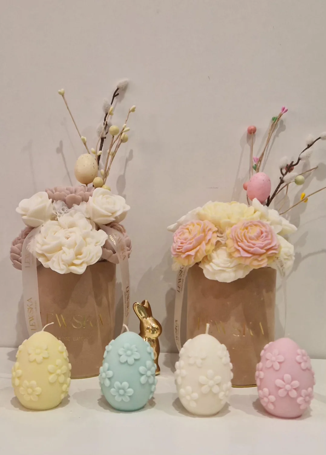 Te małe, urocze jajeczka z wosku sojowego to subtelna dekoracja, która od razu wprowadza wielkanocny klimat. Ozdobione delikatnymi kwiatkami w kolorach bezu, różu, bieli i żółci, zachwycają detalem i świeżością formy.