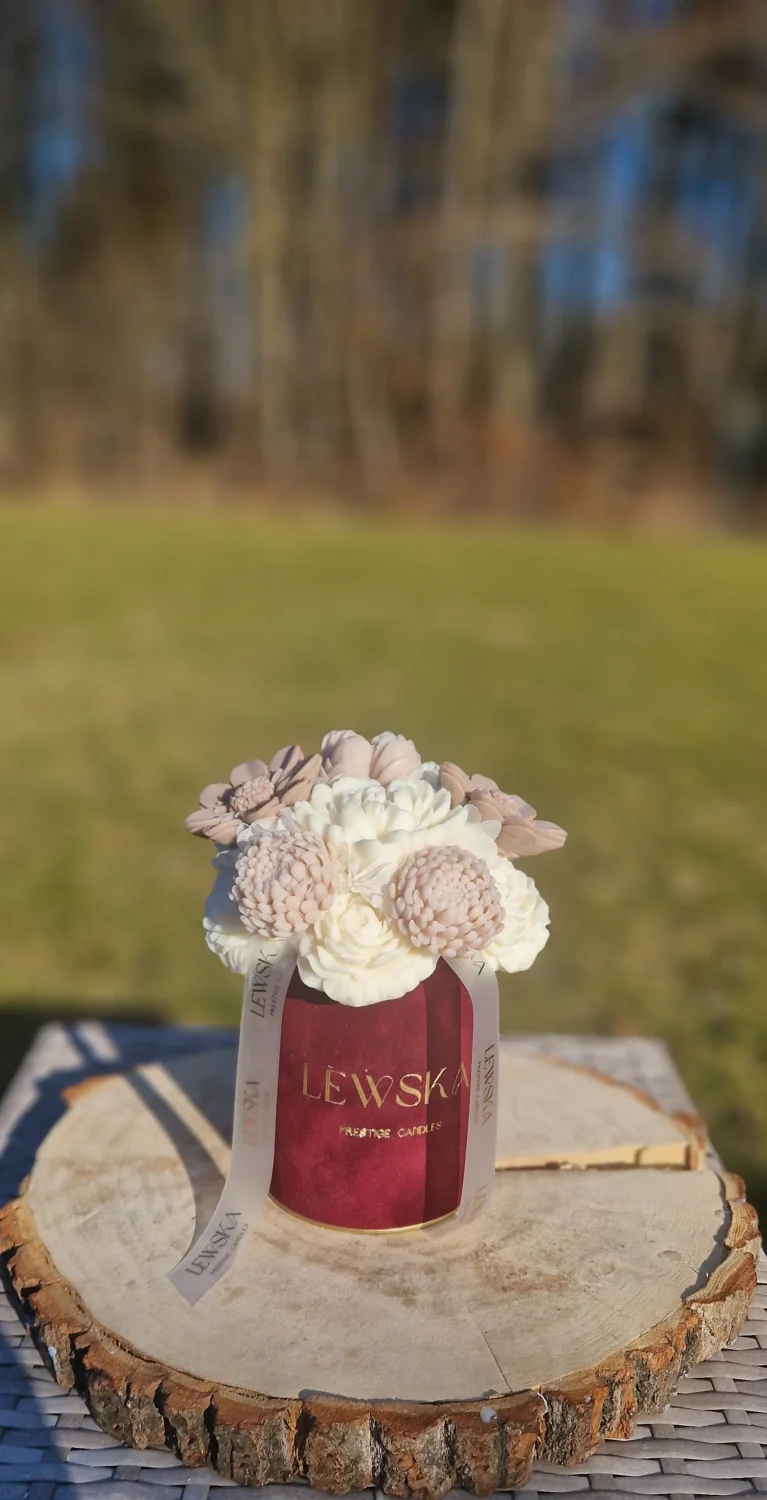 Te bukiety sojowe to połączenie elegancji, natury i zapachu, który buduje klimat wnętrza od pierwszego spojrzenia. Bordowe pudełko w duecie z biało beżowymi kwiatami z wosku sojowego tworzy harmonijną, ponadczasową kompozycję – idealną zarówno do nowoczesnych, jak i klasycznych wnętrz.