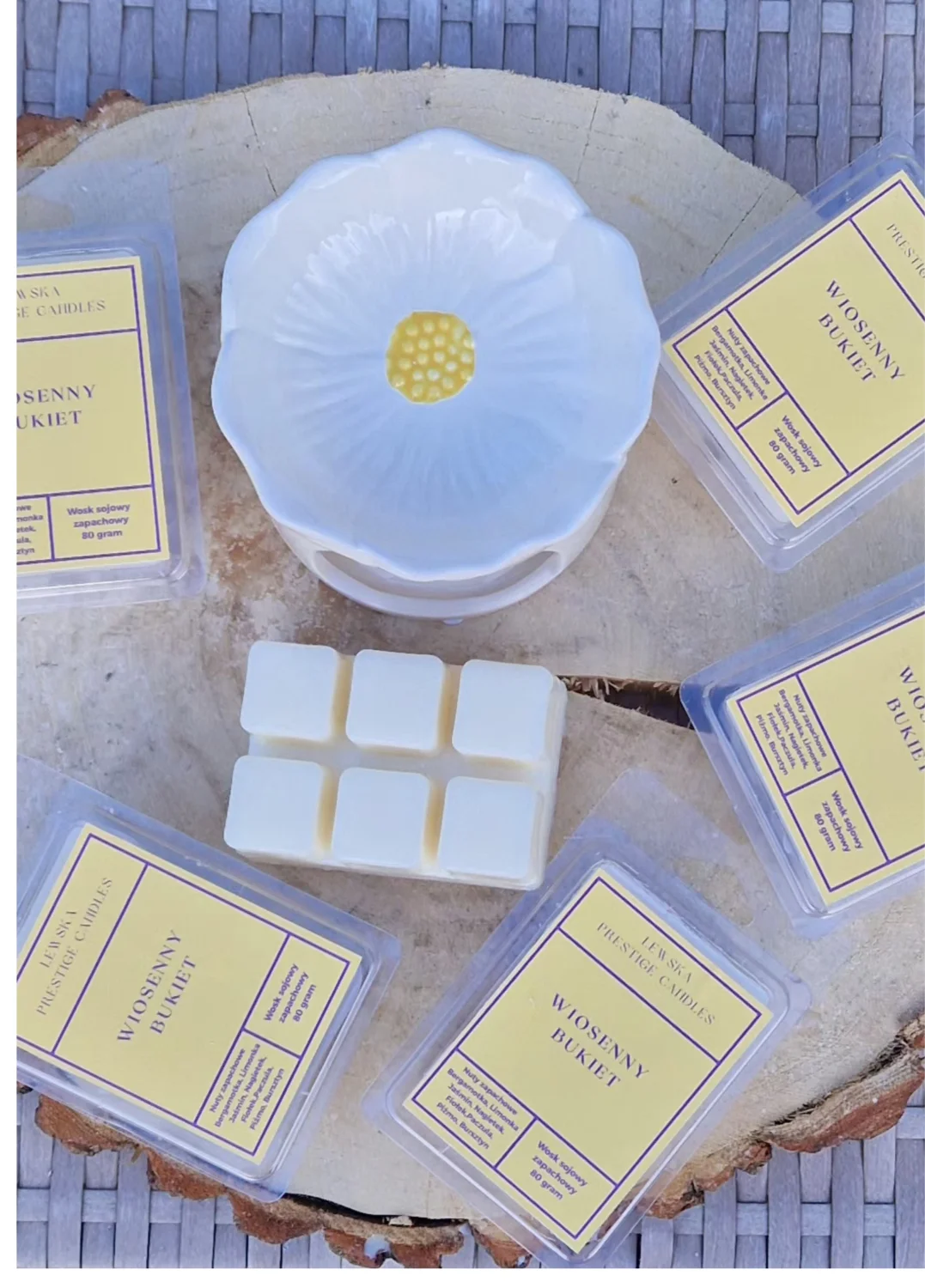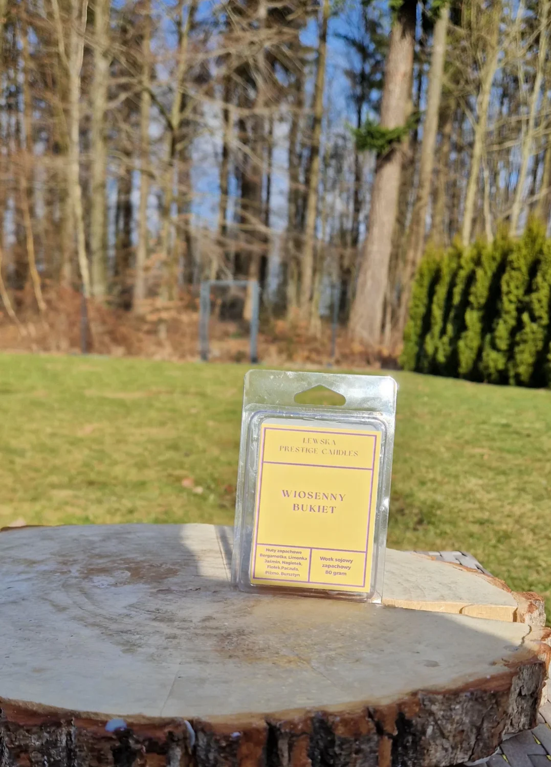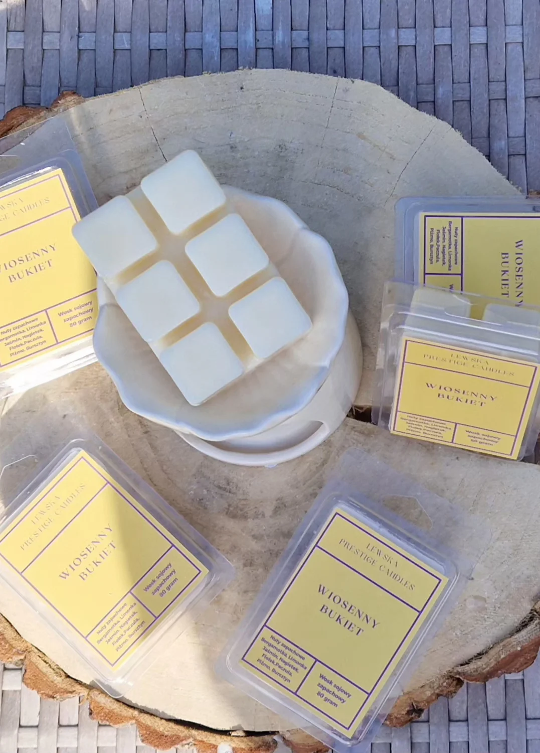 Zapach WOSKU "Wiosenny Bukiet" który otula- lekki na początku , zmysłowy na końcu. Pierwszy kontakt to świeży, soczysty duet bergamotki i limonki- czysty, energetyczny idealny na start dnia i do odświeżenia przestrzeni. Po chwili zapach mięknie i przechodzi w kwiatowe serce: jaśmin, fiołek i delikatny nagietek nadają mu elegancji, spokoju i subtelnej kremowości. Na koniec otula nas paczuła, piżmo i bursztyn - to one sprawiają ze zapach unosi się długo w powietrzu i daje efekt domowego komfortu i relaksu.